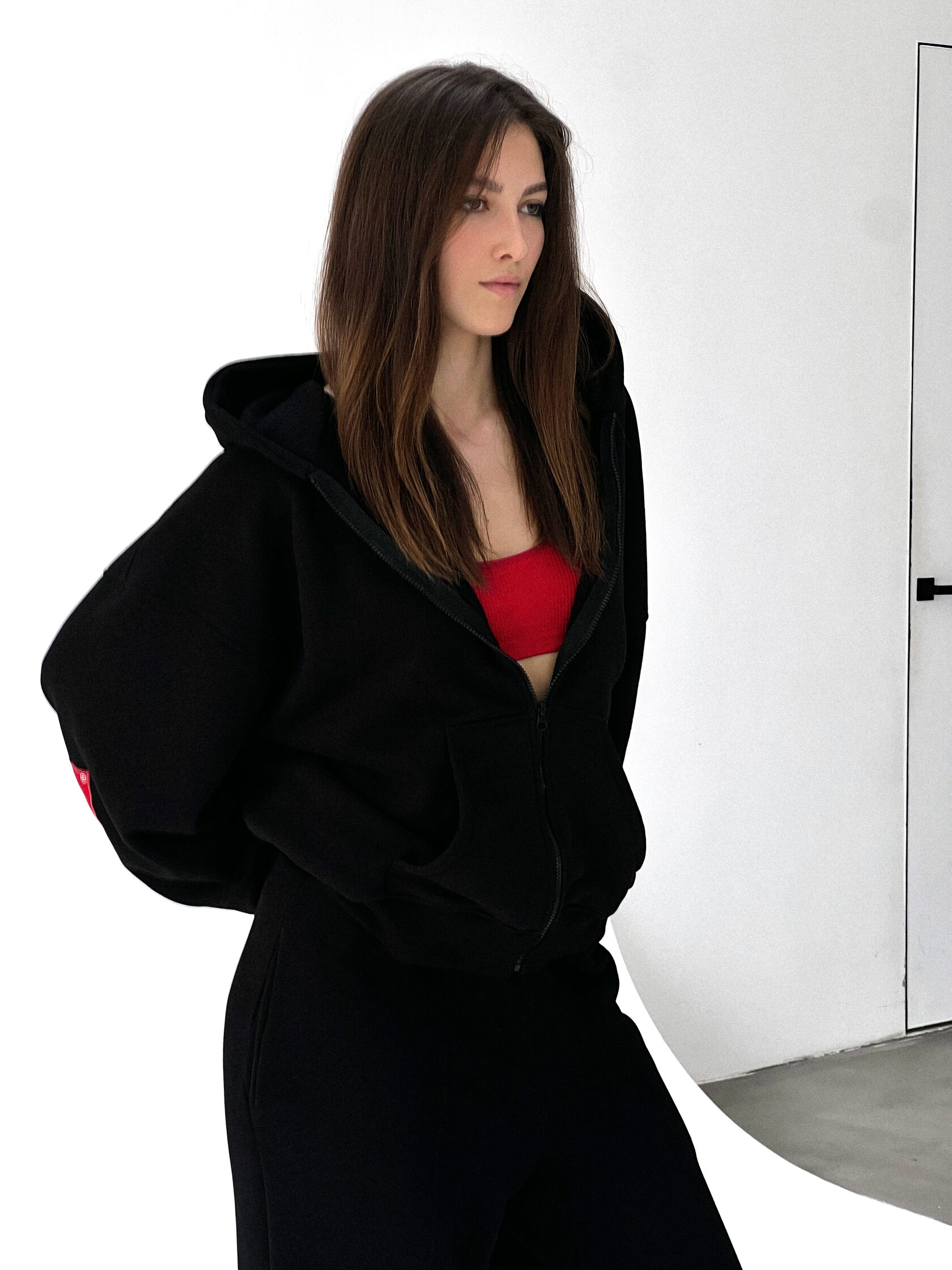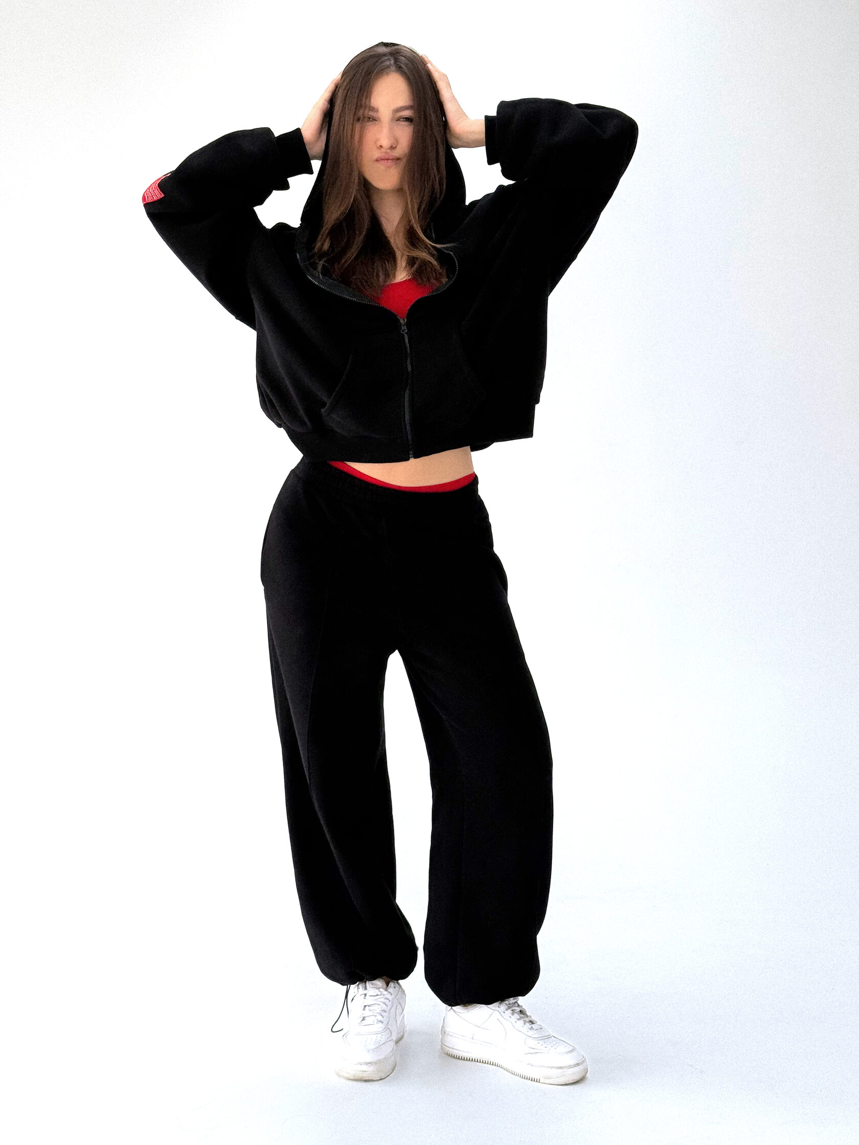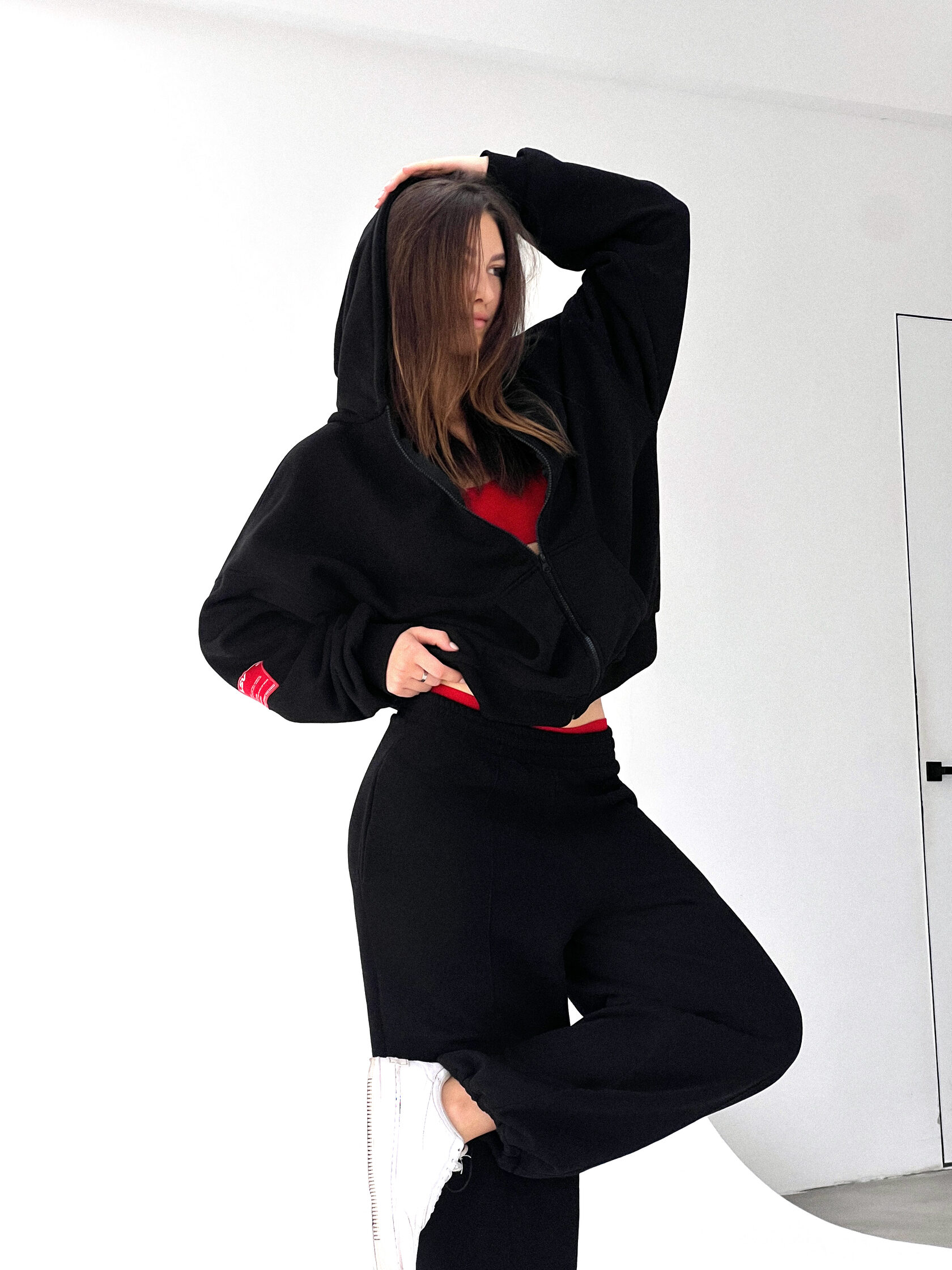 Костюм из 80% хлопка и 20% полиэстра свободного кроя. Oversized Цвет: черный. Сделано в России, собственное производство. Рекомендация по уходу за изделием: деликатная машинная стирка на 30 градусах, до 600 оборотов при отжиме.